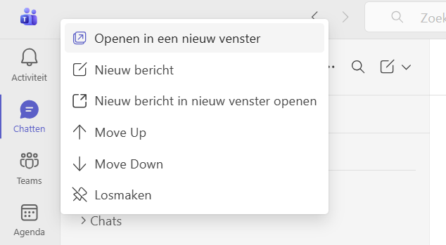 Klik met je rechtermuisknop op een chat, kanaal, bestand, vergadering of agenda-item en kies 'Openen in nieuw venster'. Teams opent direct een tweede (of derde…) venster zodat je vrij kunt schuiven en multitasken.